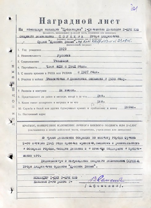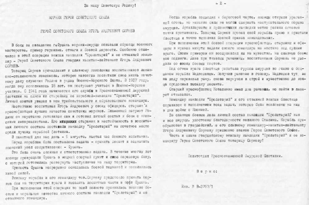 Указом Президиума Верховного Совета СССР от 14 сентября 1945 года за образцовое выполнение боевых заданий командования на фронте борьбы с японскими империалистами, доблесть и отвагу старшему лейтенанту Сорневу Игорю Андреевичу присвоено звание Героя Советского Союза с вручением ордена Ленина и медали «Золотая Звезда» (N 7131). Канонерская лодка «Пролетарий» получила звание гвардейской 30 августа 1945 года.