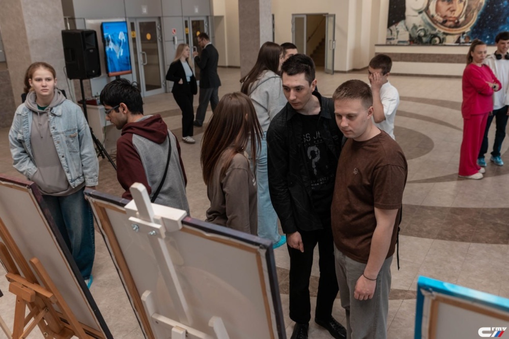 Участники открытия выставки, которое состоялось 20 мая 2025 года в фойе Научно-информационного центра СГТУ имени Гагарина Ю.А., студенты Политеха, школьники, узнали об истории покорения космоса через произведения живописи, увидев, как художники 1960-1980 гг. воспринимали и передавали темы покорения космоса и дальнейшего развития человечества.